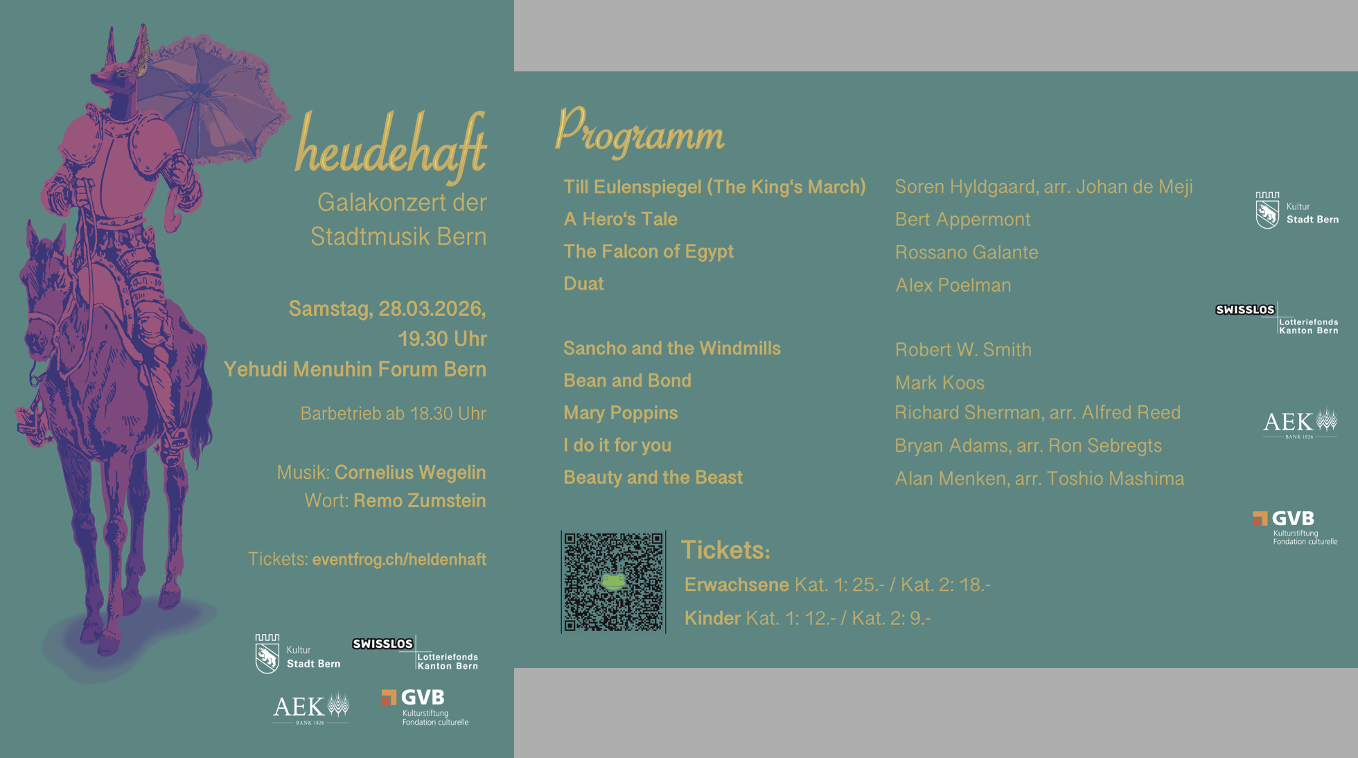 Am 28. März 2026 spielt die Stadtmusik Bern unter der Leitung von Cornelius Wegelin im Yehudi Menuhin-Forum Bern Geschichten von sagenhaften und wahren Held:innen. Der Slam-Poet und Sprachliebhaber Remo Zumstein gestaltet das Gala-Konzert mit, indem er die musikalischen Heldengeschichten mit sprachlichen ergänzt, verbindet und vielleicht auch hinterfragt.